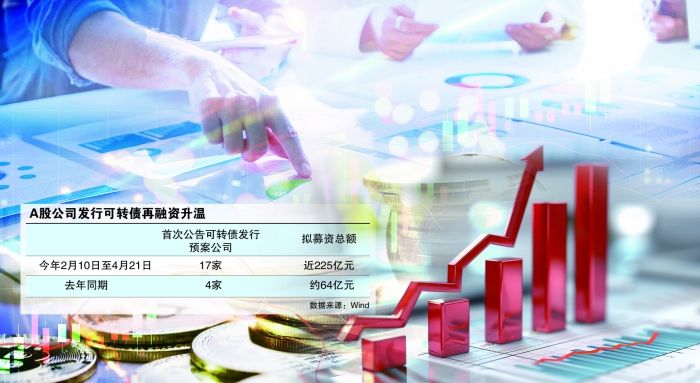 Wind数据显示,截至4月21日,再融资新规发布后已有17家上市公司首次公告可转债发行预案,拟募资总额接近225亿元。去年同期,仅4家公司发布预案,拟募资总额约为64亿元。