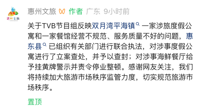 4月21日,惠州市文化广电旅游体育局官方认证的视频号“惠州文旅”对此回应:关于TVB节目组反映双月湾平海镇一家涉旅度假公寓和一家餐馆经营不规范、服务质量不好的问题,惠东县已组织有关部门进行联合执法,对涉事度假公寓进行了立案查处,并予以查封;对涉事海鲜餐厅给予挂黄牌警示并责令停业整顿。感谢网友关注,我们将持续加大旅游市场秩序监管力度,切实规范旅游市场秩序。