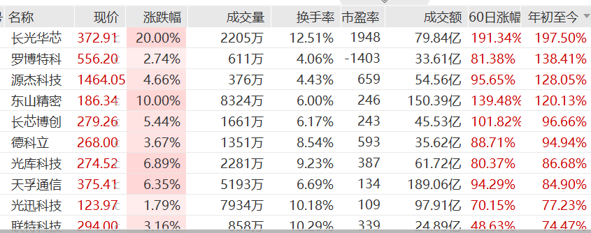 光模块多股走强,龙头新易盛午后涨7.6%,续创历史新高,总市值突破6000亿元。长光华芯20cm涨停创历史新高,东山精密午后涨停同创历史新高。值得注意的是,年内已有4只CPO股涨幅翻倍,分别是长光华芯、罗博特科、源杰科技、东山精密,其中长光华芯涨幅近200%。