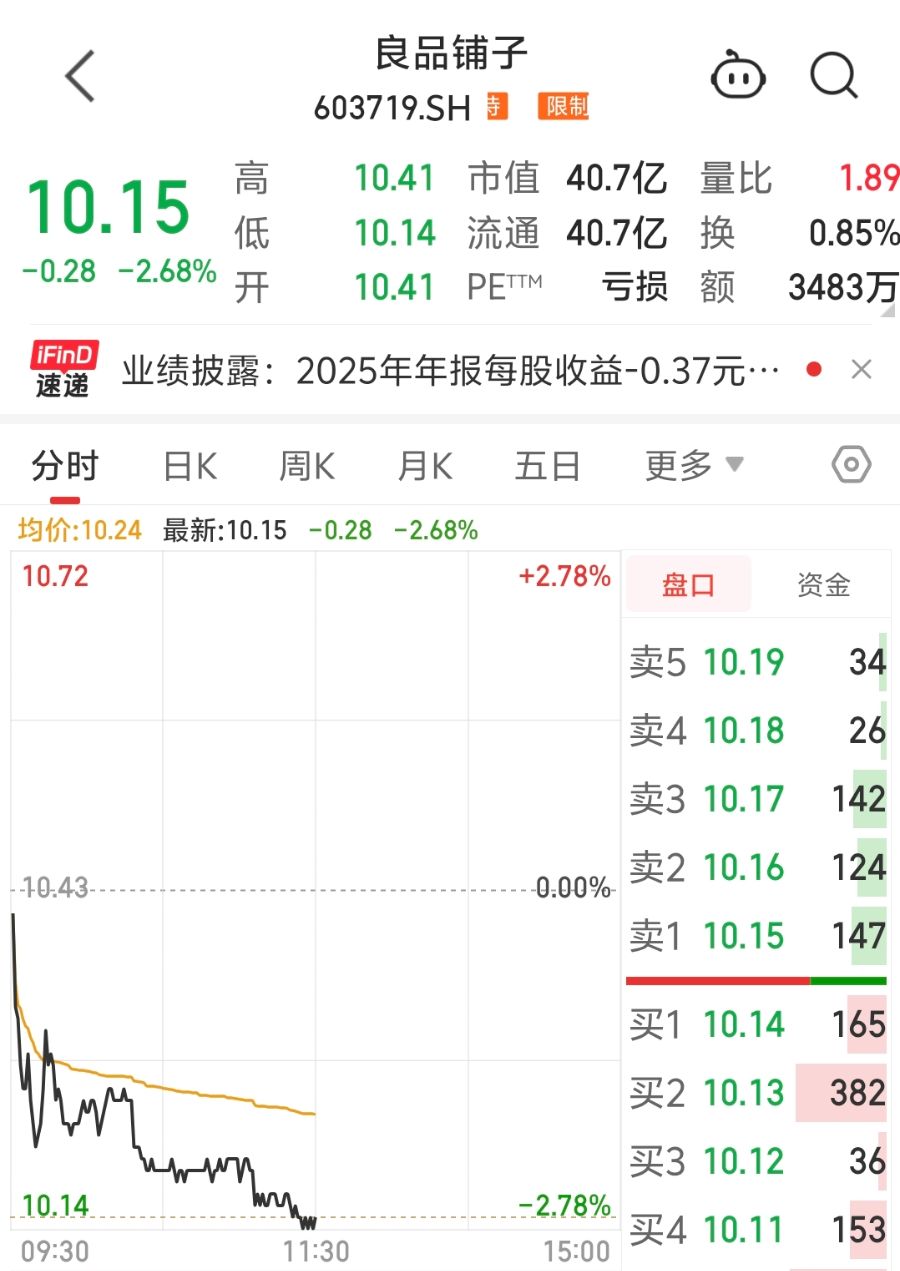 4月22日,休闲零食第一股的良品铺子低开低走,截至午间收盘,报10.15元/股,跌幅达2.68%。