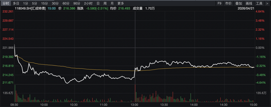 Wind数据显示,汇成转债4月21日收盘价为216.39元/张,以此价格计算,若不及时交易或转股,投资者或将亏损53.65%。至4月21日收盘,汇成转债未转股比例为11.50%,转债余额为1.32亿元。