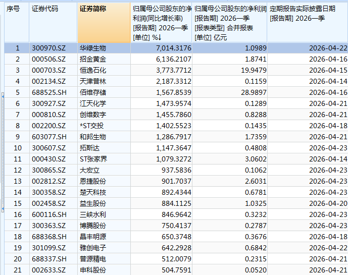 上述11家2026年一季度净利润增速超过10倍的公司分别是:华绿生物、招金黄金、恒逸石化、天津普林、佰维存储、江天化学、创维数字、*ST交投、和邦生物、拓斯达、ST张家界。