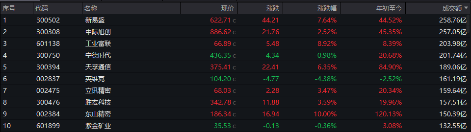 个股方面,新易盛全天成交额超258亿元位居沪深两市第一,中际旭创、工业富联等成交额居前。