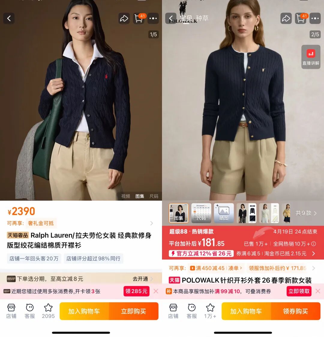 天猫旗舰店显示,拉夫劳伦服饰在490-42900元区间,POLOWALK服饰则在50-1000元区间。其中最火爆的绞花毛衣开衫,拉夫劳伦卖2390元,POLOWALK折后卖181元;男士短袖POLO衫,拉夫劳伦卖1290元,POLOWALK折后卖122元。