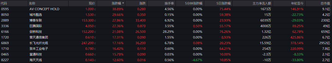 截至收盘,剑桥科技(06166.HK)涨21.08%,长飞光纤光缆(06989.HK)涨17.16%。