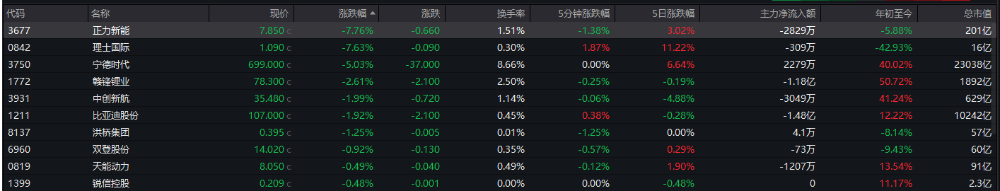 截至收盘,理士国际(00842.HK)跌7.63%,宁德时代(03750.HK)跌5.03%,赣锋锂业(01772.HK)跌2.61%。