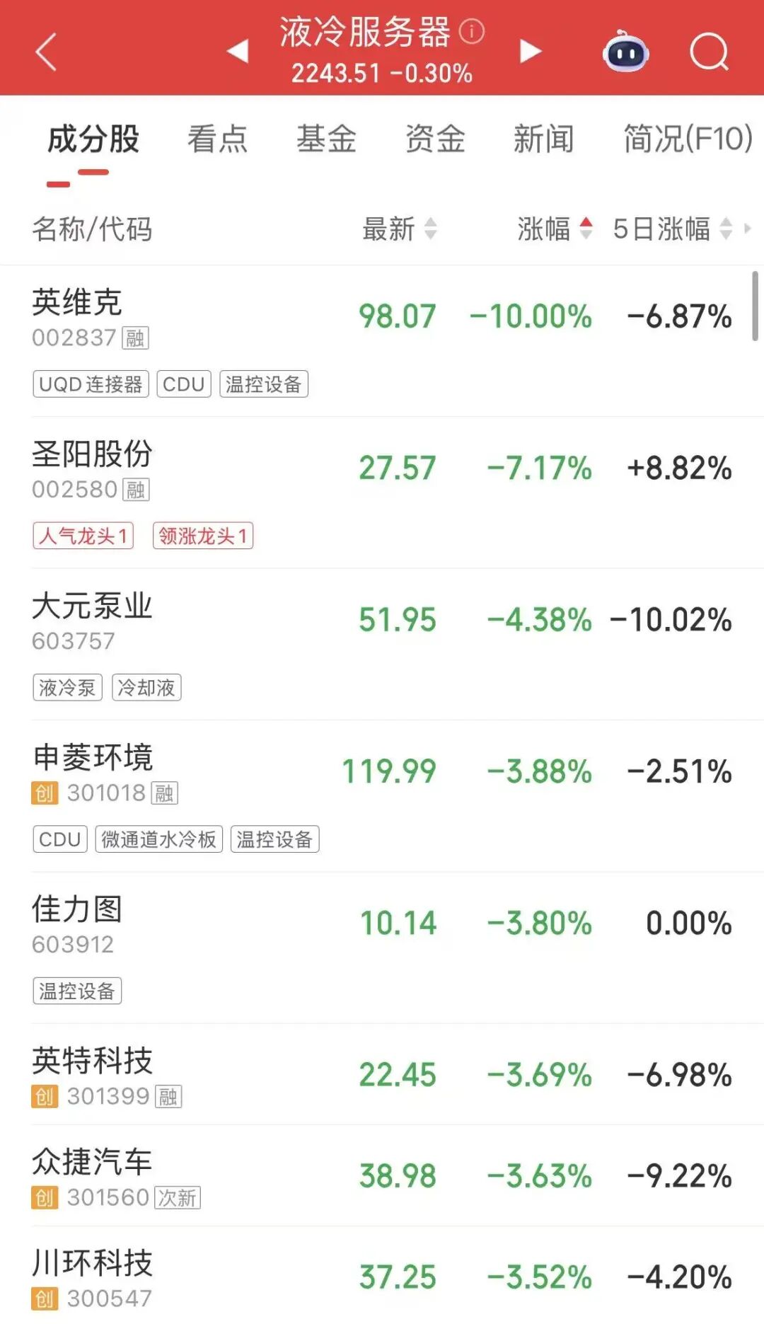液冷服务器概念继续走弱,千亿龙头英维克2连跌停,圣阳股份、大元泵业、佳力图等跟跌。消息面上,英维克4月20日晚间发布一季度业绩公告称,归属于上市公司股东的净利润约866万元,同比减少81.97%,在其业绩发布前,股价月内累计涨幅已超40% 。