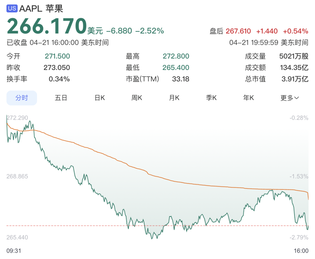 当地时间4月21日,受苹果官宣CEO换届影响,公司股价盘中下探超2%,总市值失守4万亿美元关口,收盘报3.91万亿美元。