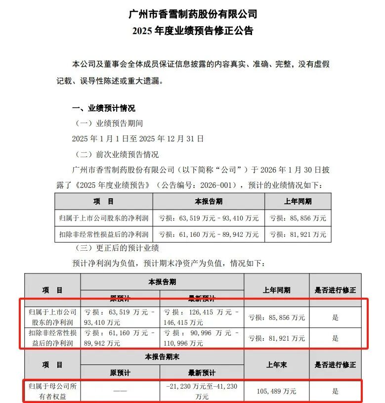 4月22日晚间,ST香雪披露2025年度业绩预告修正公告,公司大幅下调年度亏损规模,同时披露2025年末归属于母公司所有者权益预计为负值,公司股票存在被实施退市风险警示的风险。