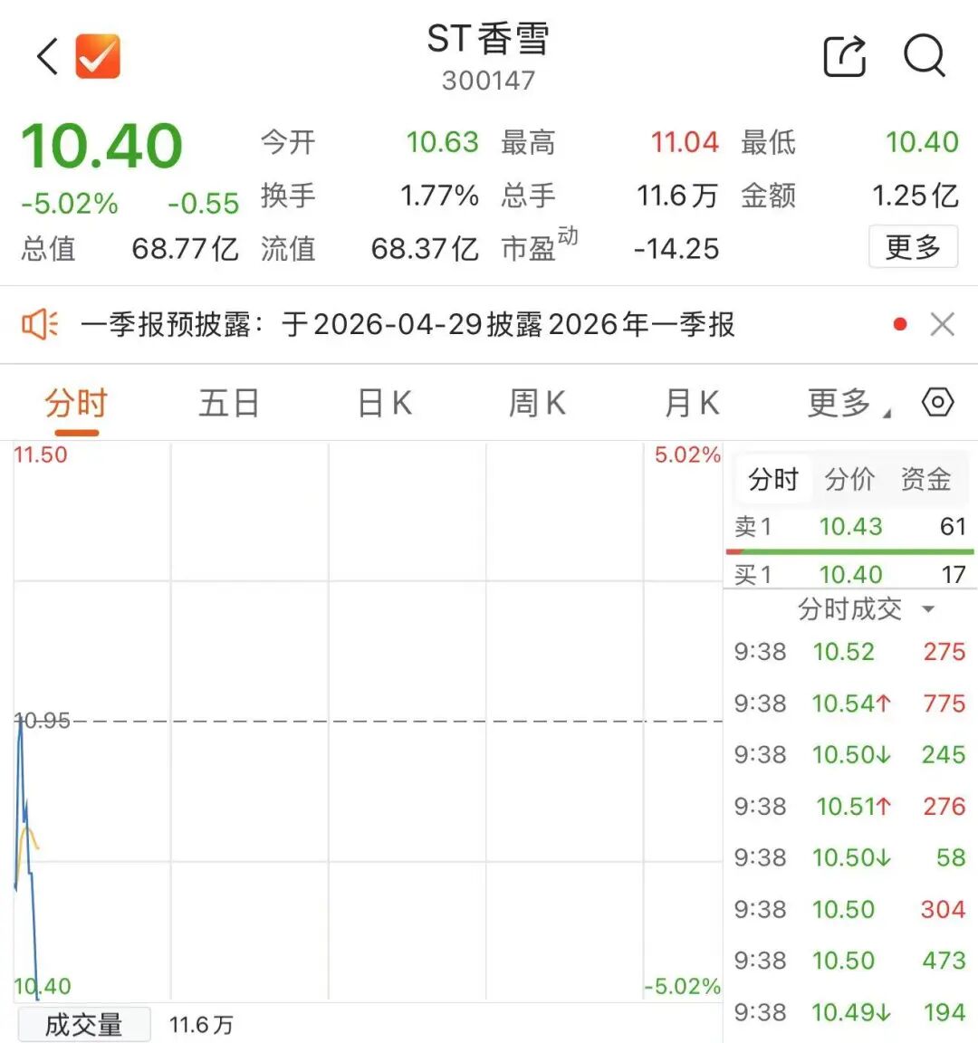 4月23日早盘, ST香雪低开后短暂拉升,于9时33分左右迅速下挫,截至发稿跌超5%。而在前一日午后 ,ST香雪突然异动,一度大涨超8%,截至收盘涨7.78%,全天振幅达11.02%。