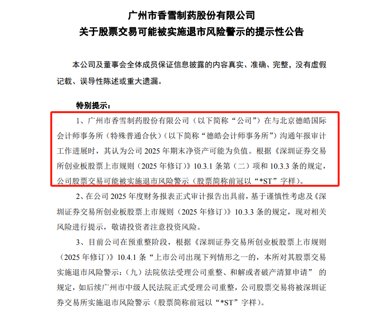 ST香雪指示,根据深交所创业板上市规则相关规定,若经年度审计确认2025年末净资产为负值,公司股票将在2025年度报告披露后被实施退市风险警示,证券简称将变更为*ST香雪。