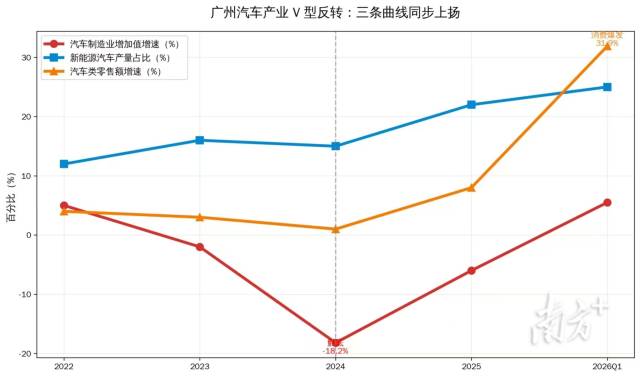 从2024年增加值暴跌18.2%的谷底,到2026年一季度5.5%的正增长;从新能源产量同比下降16.5%,到同比大增36.1%——这条V型反转曲线,见证了一座汽车重镇在产业变革浪潮中如何走出阵痛、完成转身。