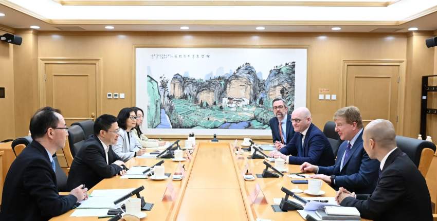 2026年4月21日下午,财政部副部长廖岷在北京会见美国奥尔布赖特石桥集团高级顾问薄迈伦,就中美经贸关系、中国宏观经济形势与财政政策、高水平对外开放等议题交换了意见。