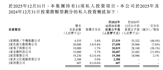 公告还显示,截至 2025年末,其持有11个私人投资项目,标的公司覆盖在线互动娱乐、手游、金融科技、电商、云服务、消费等领域。