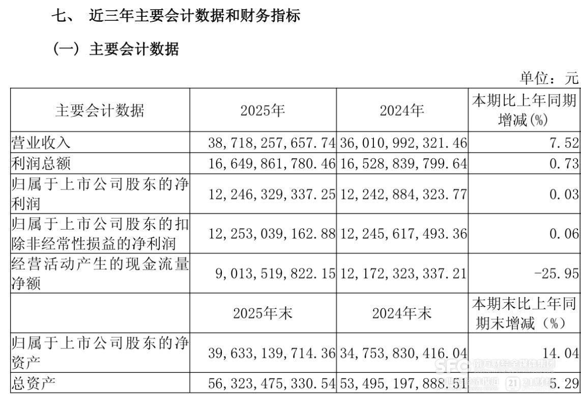 4月22日,山西汾酒披露年报:2025年实现收入387.18亿元,同比增长7.52%,实现归母净利润122.46亿元,同比增长0.03%。