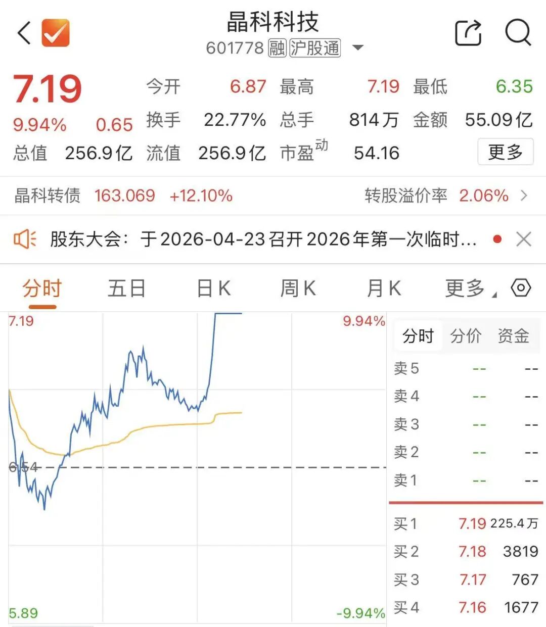4月23日午后,绿电概念再度异动,算电协同方向领涨,晶科科技(601778)直线涨停,截至发稿最新股价报7.19元/股。此前华电能源涨停,绿发电力、军信股份、新天绿能、南网能源、粤电力A跟涨。