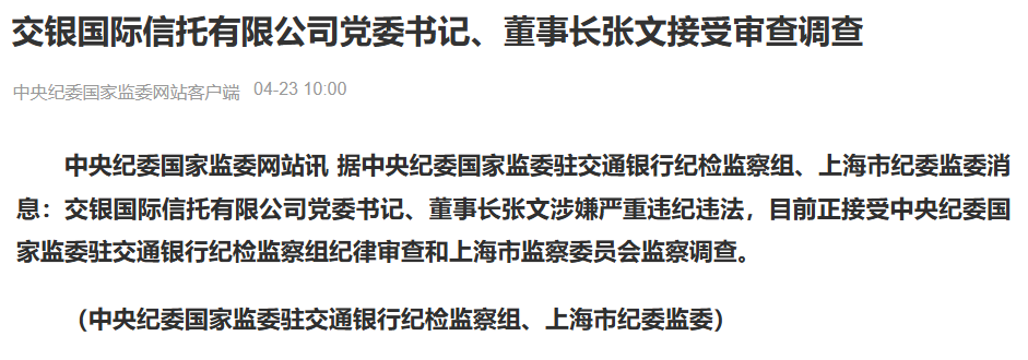 据中央纪委国家监委驻交通银行纪检监察组、上海市纪委监委消息:交银国际信托有限公司党委书记、董事长张文涉嫌严重违纪违法,目前正接受中央纪委国家监委驻交通银行纪检监察组纪律审查和上海市监察委员会监察调查。
