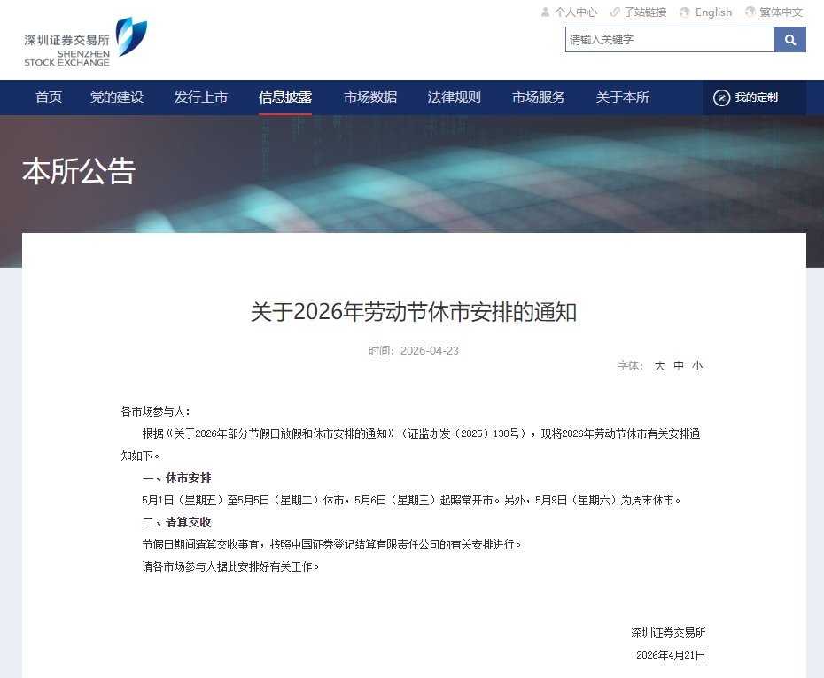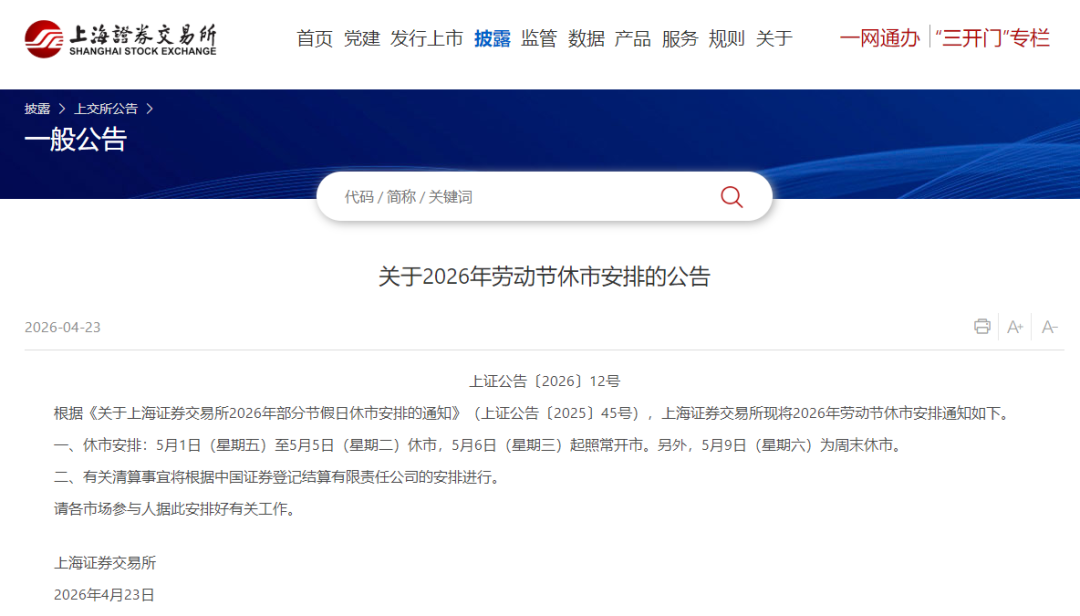 4月23日,沪深北交易所发布关于2026年劳动节休市安排的公告。