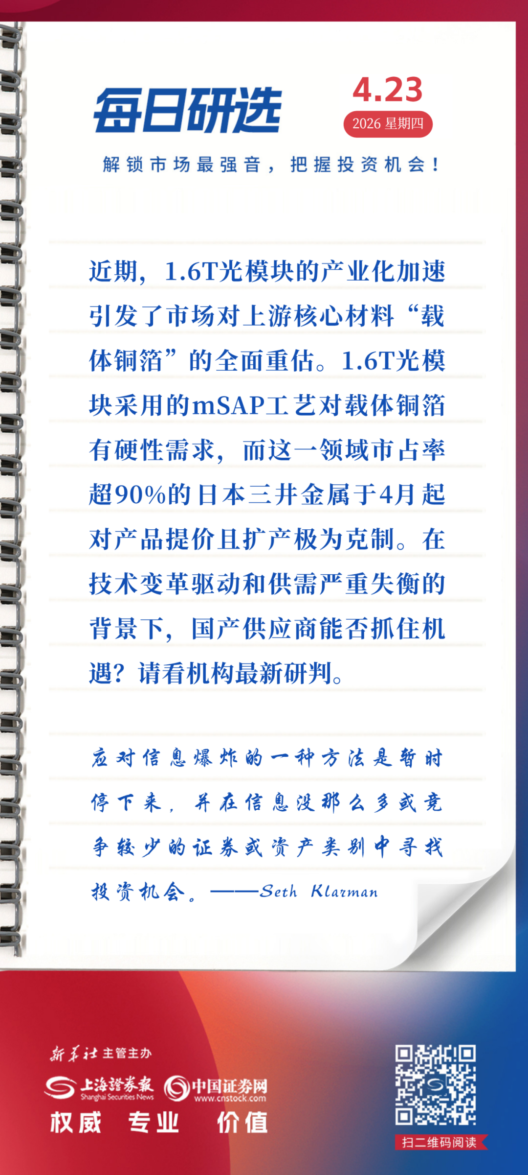 近期,1.6T光模块的产业化加速引发了市场对上游核心材料“载体铜箔(DTH/MicroThin)”的全面重估。1.6T光模块采用的mSAP工艺对载体铜箔有硬性需求,而这一领域市占率超90%的日本三井金属于4月起对产品提价且扩产极为克制。在技术变革驱动和供需严重失衡的背景下,国产供应商能否抓住机遇?请看机构最新研判。