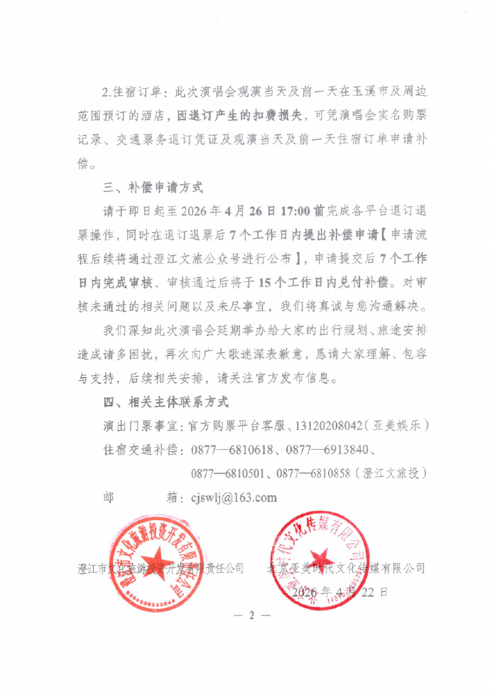 此次 演唱会观演当天及前一天在玉溪市及周边范围预订的酒店实际退订手续费,给予补偿。
