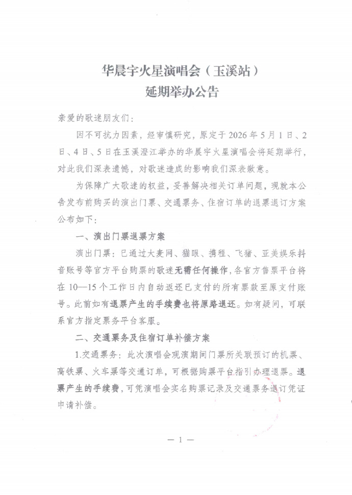 随后华晨宇工作室发通知表示:受不可抗力因素影响, 原定于2026年5月1、2、4、5日在云南玉溪澄江抚仙湖音乐秀场举办的2026华晨宇火星演唱会乐园2.0将延期举行 ,具体举办时间另行通知。火星演唱会官方微博将公布演出门票退票以及交通、住宿补偿方案。