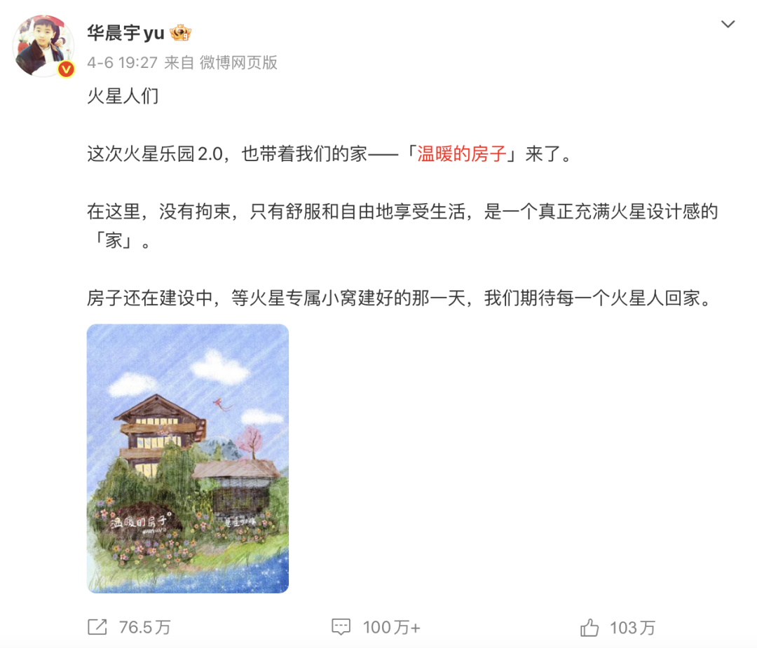 公开资料显示,“火星乐园2.0”是华晨宇推出的升级版火星演唱会乐园模式。此前,“火星乐园1.0”始于2021年,首创乐园式演唱会,主要通过户外临时大型搭建,打造包含音乐、游乐、艺术、互动的复合场景。2026年2月,华晨宇在深圳演唱会现场宣布,在“一个四季如春的地方拿下了三块地”,准备打造“专属于火星的家园”。3月,华晨宇发文宣布火星乐园2.0“终于要来了”,“我们把‘火星’从一个概念,变成一个真正属于我们的‘家’。”4月6日,他写道,“这次火星乐园2.0,也带着我们的家——‘温暖的房子’来了”,并附上了一张题为《温暖的房子》的画。
