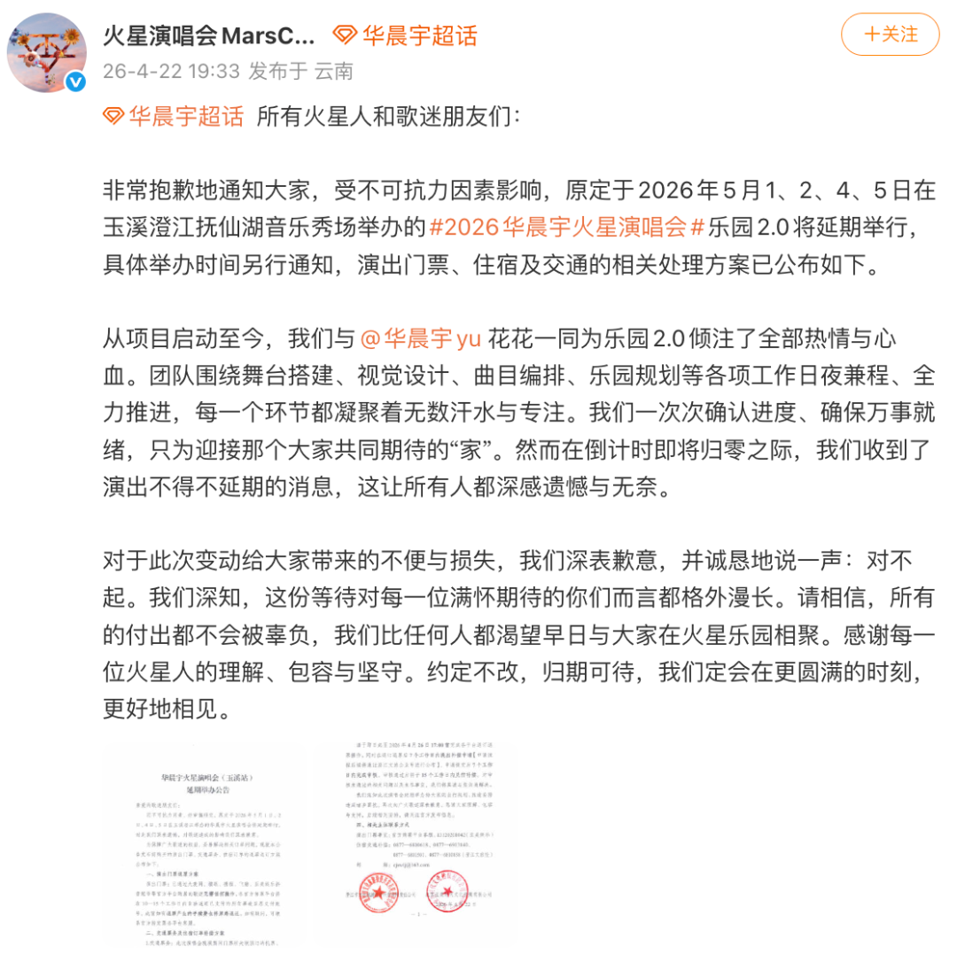 4月22日晚,歌手华晨宇在社交平台发文称,其火星演唱会因不可抗力延期。