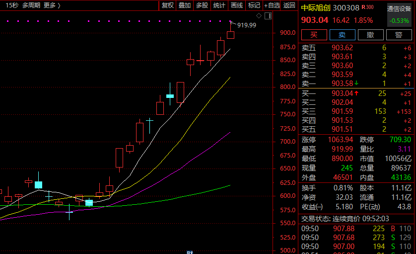 中际旭创( 300308 )盘中一度涨超 3% ,成为继工业富联后第二只总市值突破 1 万亿的算力硬件股,该股自去年 4 月 22 日以来累计上涨超 900% 。