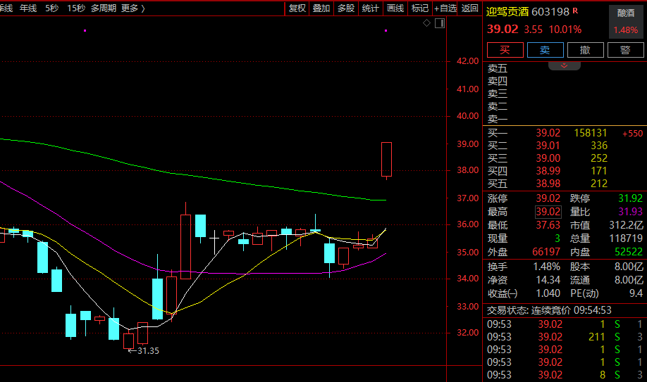 白酒板块走高,迎驾贡酒涨停,老白干酒、山西汾酒、古井贡酒、今世缘等跟涨。
