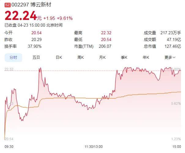 4月23日,博云新材股价强势大涨9.61%,收盘价为22.24元,成交额为47.19亿元,总市值攀升至127.46亿元。值得一提的是,自2026年4月7日以来的13个交易日内,博云新材股价累计涨幅超108%,表现非常亮眼。