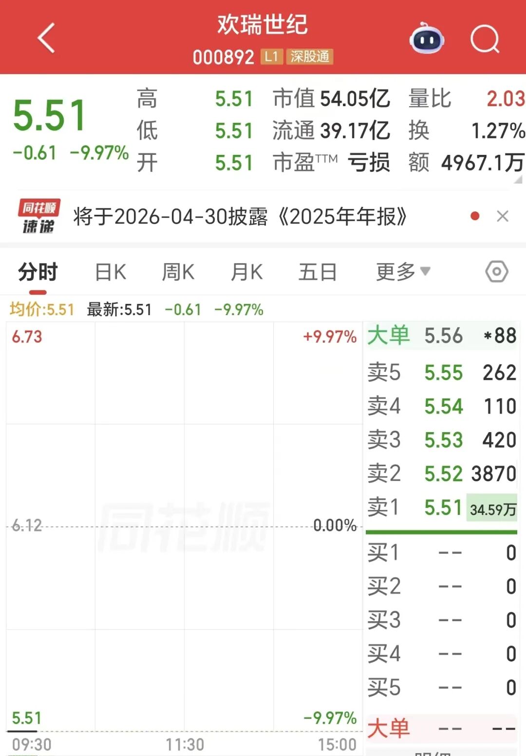 4月23日,欢瑞世纪( 000892 . SZ )股价开盘跌停。截至界面新闻发稿前,其股价报5.51元/股,市值为54亿元。