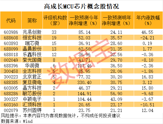 一批高成长股浮现。有15只个股机构一致预测今年、明年净利增速均超20%。其中,恒玄科技、晶晨股份、乐鑫科技等个股机构一致预测两年净利增速均超30%。