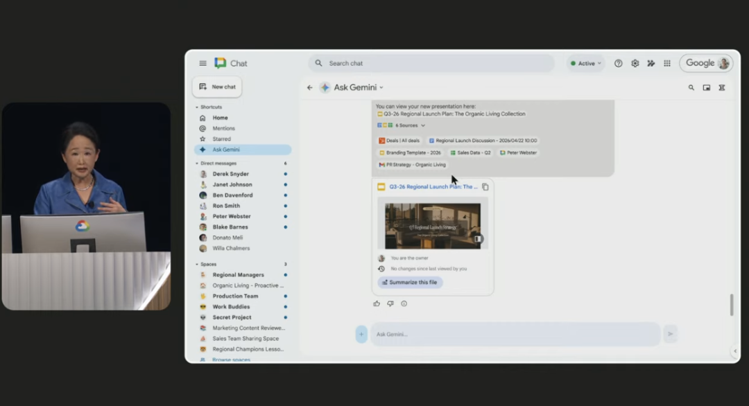 最后,作为对标“微软办公全家桶”的谷歌Workspace也迎来AI智能时代,包括Gmail邮箱的智能收件箱助手;打工人们也能综合“谷歌聊天”应用的一系列对话和企业数据,在日历上安排会议、创建谷歌文档,或者生成符合企业品牌形象的PPT。