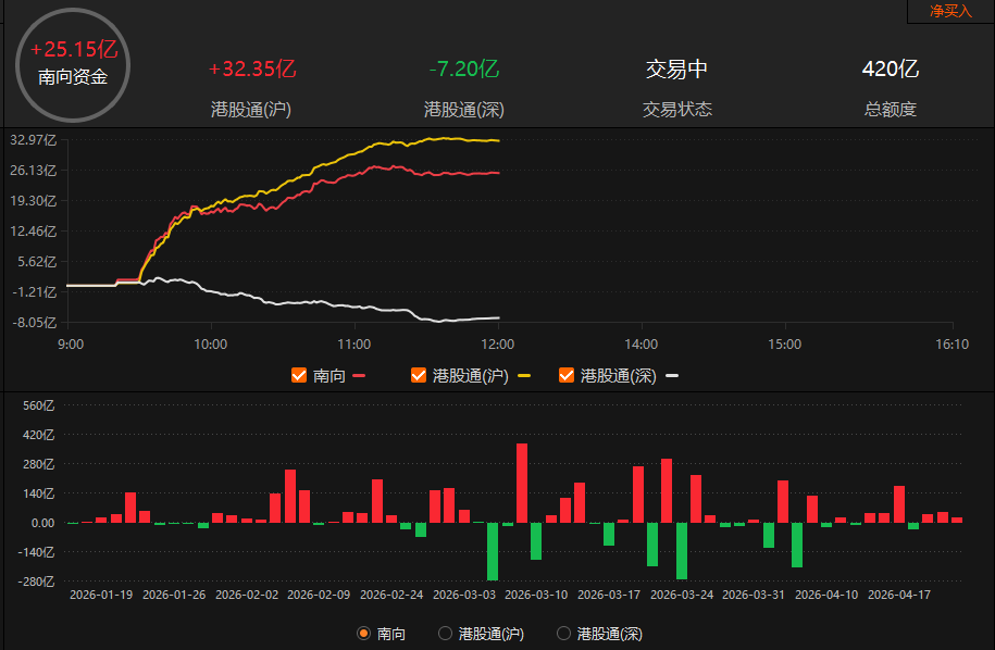 南向资金早盘净买入25.15亿元。