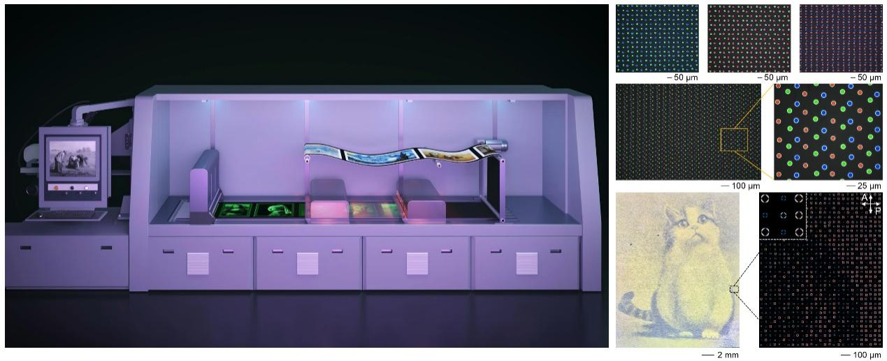 为此,科研团队开创了全新思路,设计出类似“光子织物”的多尺度微纳结构,既能像万花筒一样呈现丰富色彩,又能精准控制光的传播与色散。在此基础上,科研人员研发出卷对卷增材纳米打印设备,柔性基材在滚筒间连续输送,就能以纳米级精度快速打印出光学超材料,实现了低成本、规模化、个性化定制,让超材料生产高效又便宜。