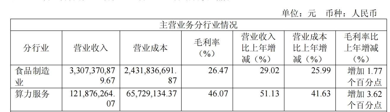 从占比来看,食品制造业务仍是公司主要收入来源,营收占比达96.45%。相较之下,算力服务收入仅占3.55%,两者收入规模相差巨大。