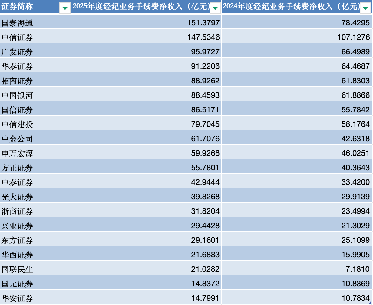 其中,国泰海通、中信证券、广发证券2025年度分别实现经纪业务手续费净收入151.38亿元、147.53亿元、95.97亿元,位列行业前三。