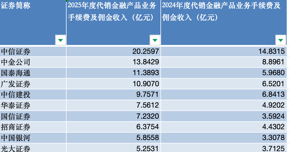 这10家券商2025年的代销收入分别为:20.26亿元、13.84亿元、11.39亿元、10.91亿元、9.76亿元、7.56亿元、7.23亿元、6.38亿元、5.86亿元、5.25亿元。