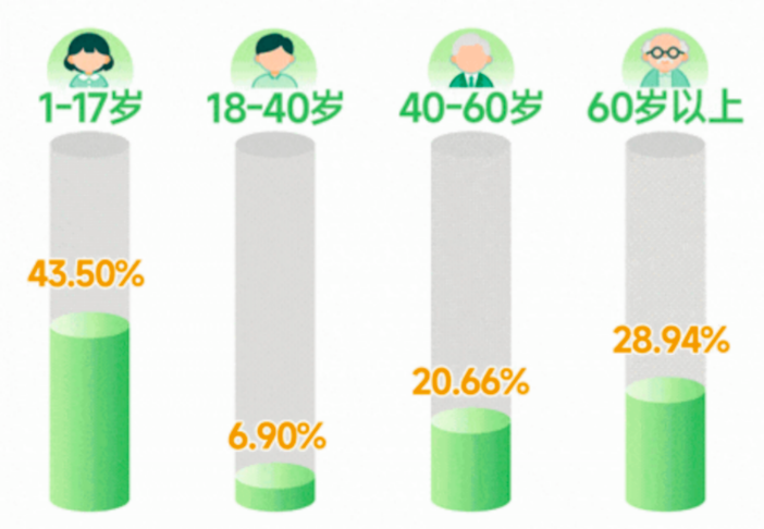 在医疗险的出险年龄分布上,整体呈现 “ 两头高、中间低 ” 的特征。以中邮保险理赔报告为例, 1 岁 -17 岁群体因免疫力较弱、自我保护能力不足,成为医疗险出险占比最高的群体; 60 岁以上老年群体因慢性病高发、行动不便易发生跌倒骨折等意外,出险占比位居第二。
