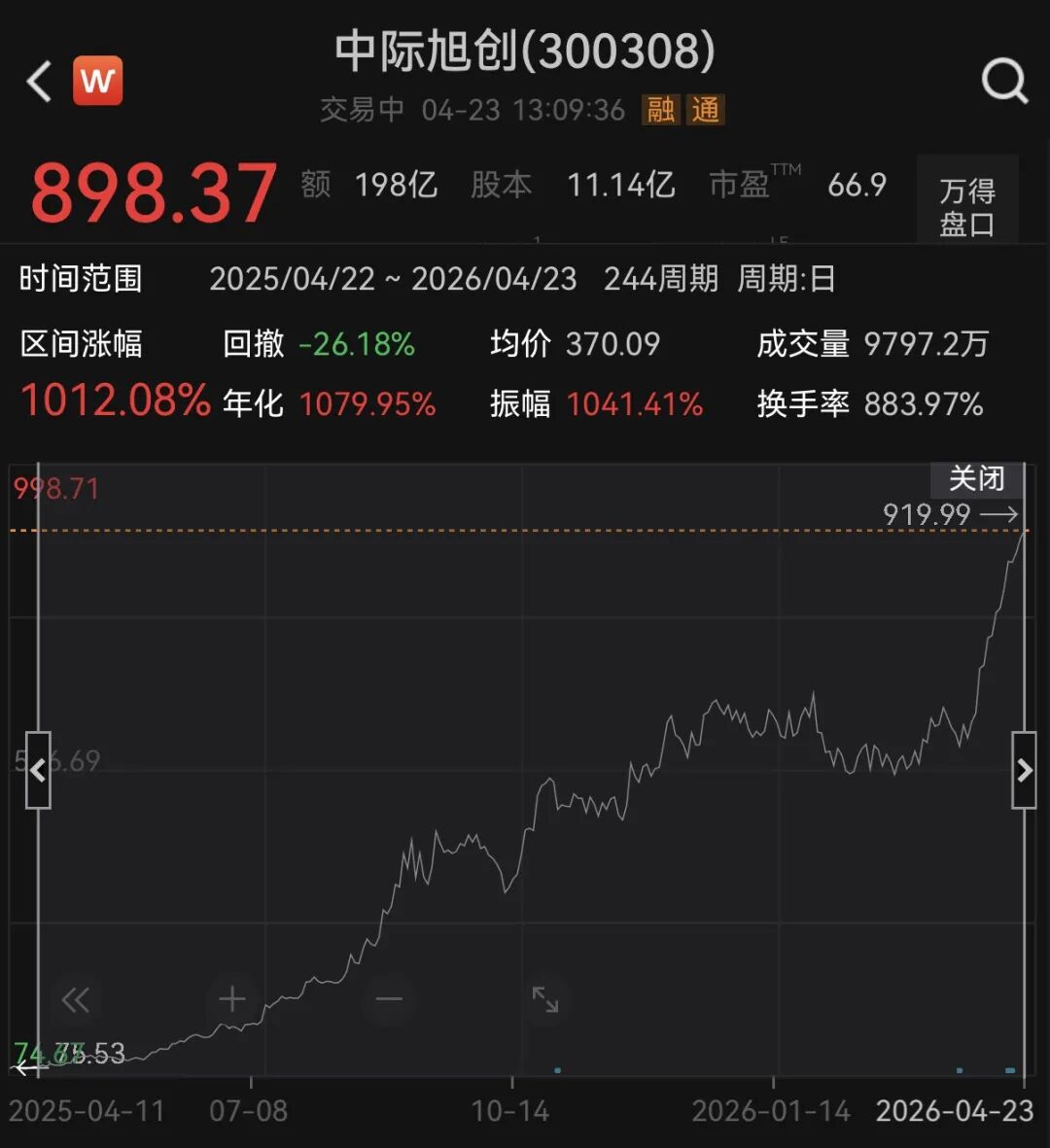 Wind数据显示,2025年4月22日至2026年4月23日13:09,中际旭创股价区间涨幅高达1012.08%,实现“1年10倍”的股价跨越。