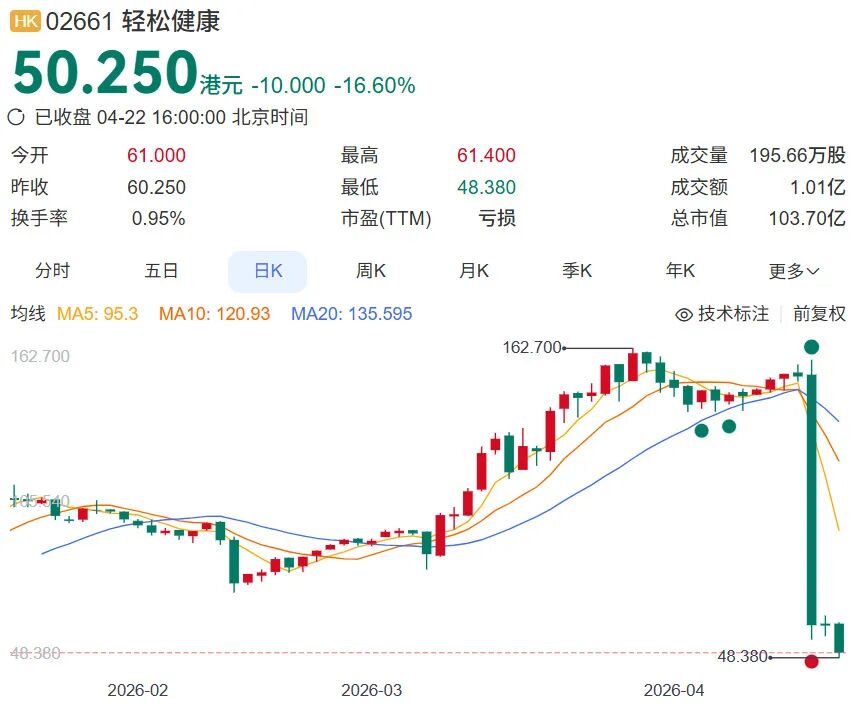 4月22日,轻松健康的股价,再度下跌16.6%,市值回落至103.7亿港元,仅仅3天,已蒸发230亿港元。