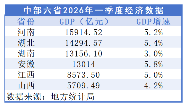 截至4月23日,中部地区河南、湖北、湖南、安徽、江西、山西六省经济“一季报”已全部出炉。