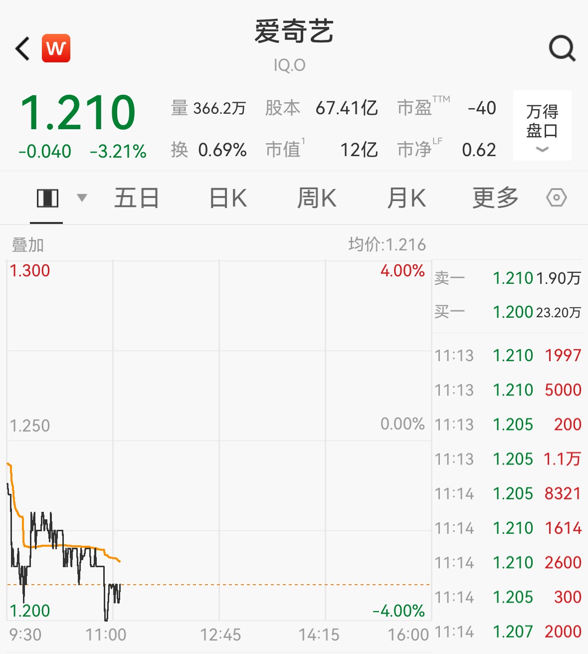 截至晚间23:10,爱奇艺美股跌3.21%,报1.210美元/股。
