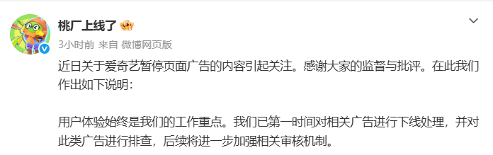 近日关于爱奇艺暂停页面广告的内容引起关注。感谢大家的监督与批评。在此我们作出如下说明: