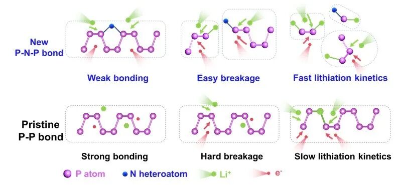 研究团队从原子尺度出发,在黑磷负极晶格中精准构筑P-N键,利用其对相邻磷-磷(P-P)键共价性的削弱作用,在锂化过程中诱导局部键断裂,活化P-P键,从而加速电荷传输,显著提升了转化反应的动力学性能。基于上述突破,团队成功制备出以黑磷为负极、磷酸铁锂为正极的软包电池,其能量密度达282瓦时/千克。该电池在高倍率充电条件下, 仅需10分钟即可充入理论容量的80%, 且历经数千次充放电循环后仍可稳定运行,展现出优异的快充循环耐久性。