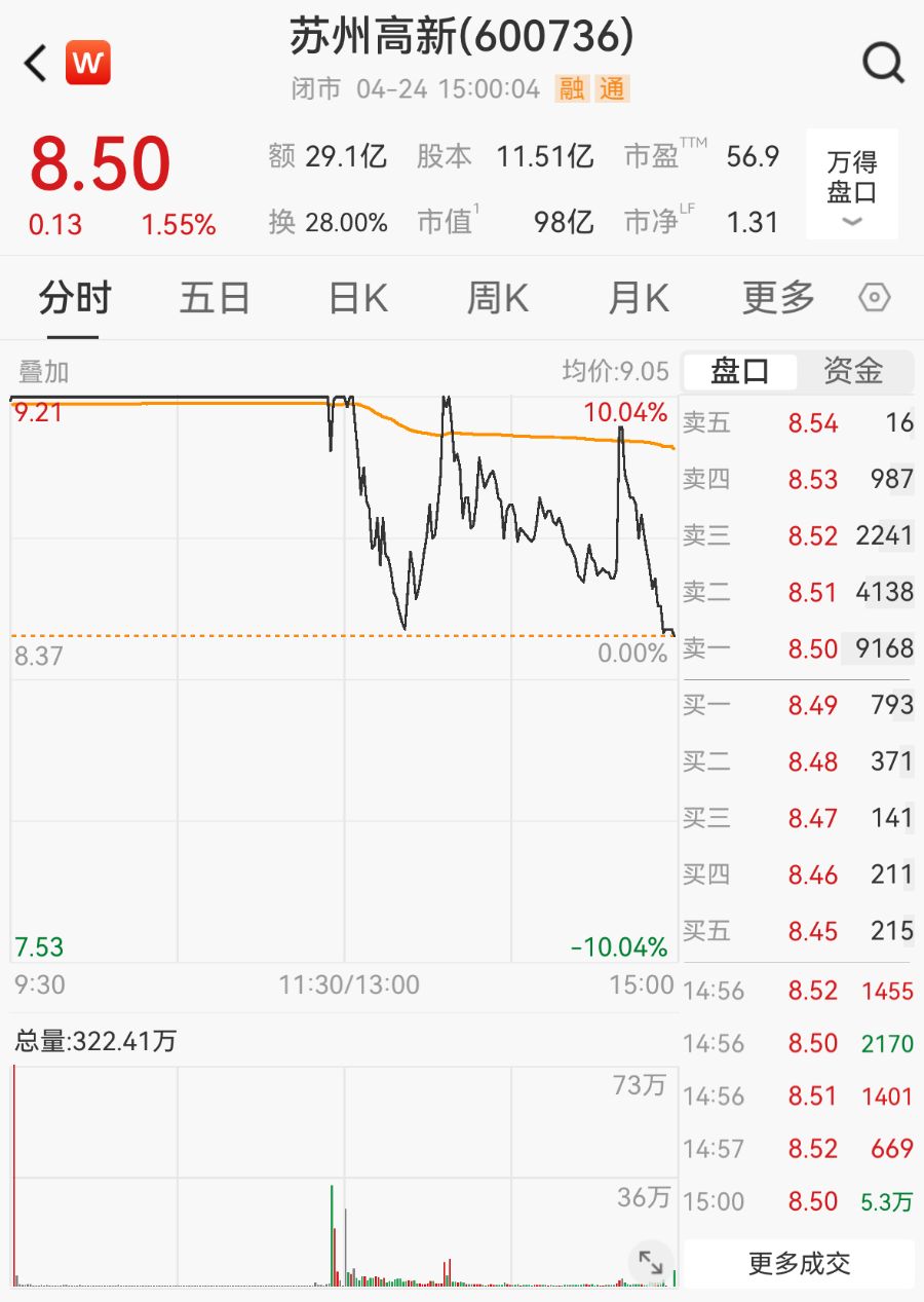 4月24日,苏州高新封板未遂,截至收盘,报8.5元/股,涨1.55%。此前,该股于4月21日至23日斩获“三连板”。
