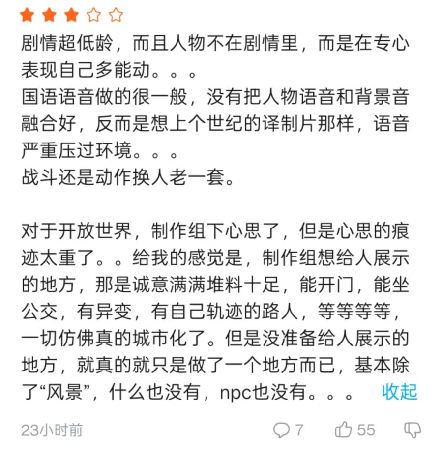 例如,有社交平台玩家表示,游戏确实在开放世界层面下了心思,但剧情、语音、战斗等层面并未能很好融合。