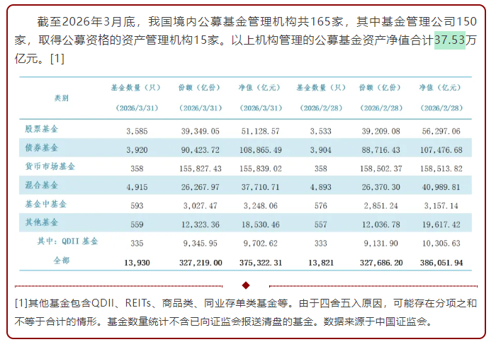 4月22日,3月份公募基金市场数据出炉,季末公募基金净值规模37.53万亿,环比2月38.61万亿缩水1.08万亿,主要由于市场波动带来的净值缩水,份额仍维持在32.7万亿左右。