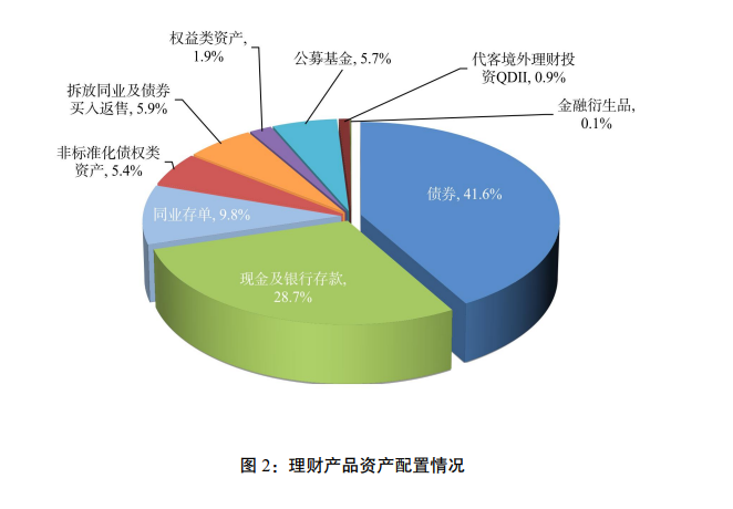 从资产配置情况看,2026年一季度末,理财产品投资资产合计34.13万亿元,同比增长9.50%。其中,理财产品资产配置以固收类为主,投向债券、现金及银行存款、同业存单余额分别为14.21万亿元、9.81万亿元、3.33万亿元,分别占总投资资产的41.6%、28.7%、9.8%。