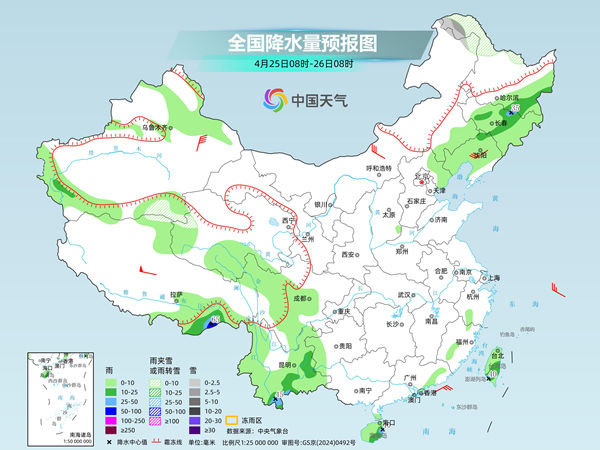 具体来看,中央气象台预计,今天,内蒙古东北部、黑龙江西北部、新疆沿天山地区等地部分地区有小到中雪或雨夹雪,其中,黑龙江西北部等地部分地区有大雪;黑龙江东南部、吉林中部、云南东北部、华南南部、海南岛、台湾岛等地部分地区有中雨,广东中南部沿海、海南岛大部、台湾岛西部等地部分地区有大雨,其中,广东东南部沿海、海南岛中部局地有暴雨。
